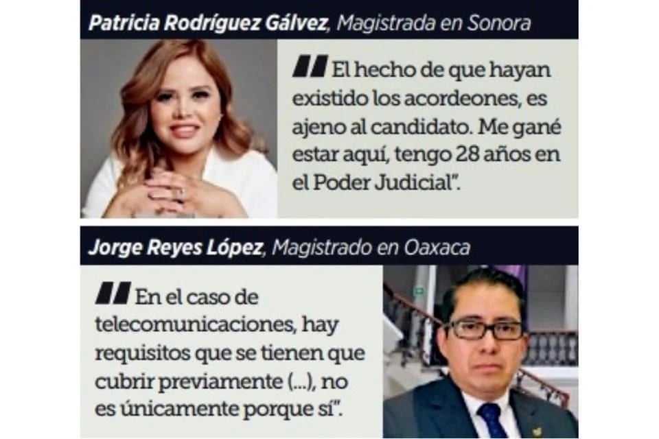 Algunos reconocieron que aparecieron en los llamados «acordeones» distribuidos por Morena, pero, argumentan, no tienen lazos con ese partido, funcionarios o gobernantes.Sin embargo, varios de ellos mantienen el discurso oficial de que llegaron para ser cercanos al pueblo, y la mayoría justificó que no son juzgadores improvisados, pues trabajaron en el Poder Judicial federal o local.Jorge Reyes López, quien será Magistrado penal en Oaxaca, consideró que la renovación del Poder Judicial no implica una injerencia directa de entes externos u otras autoridades en sus decisiones.